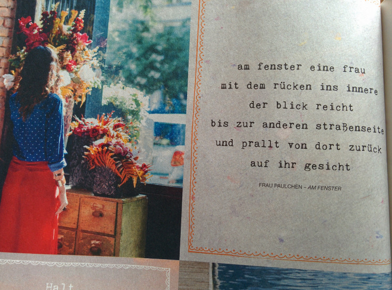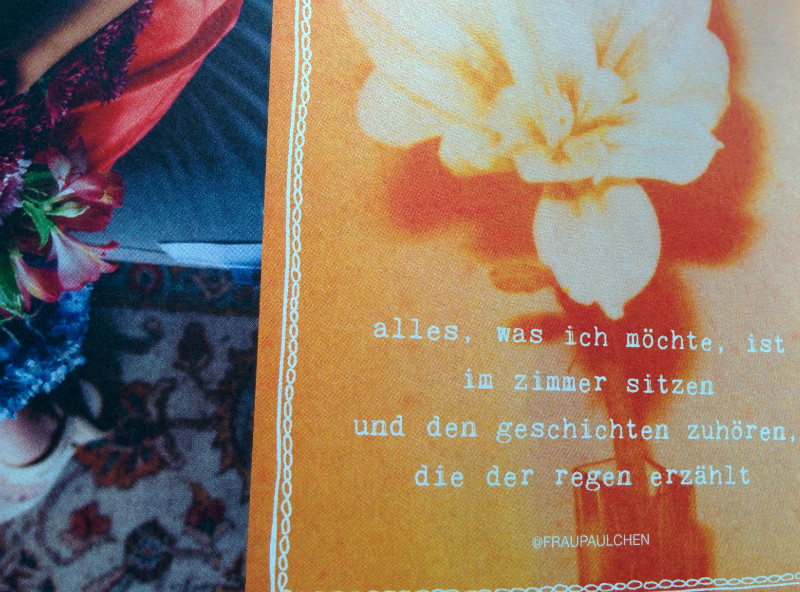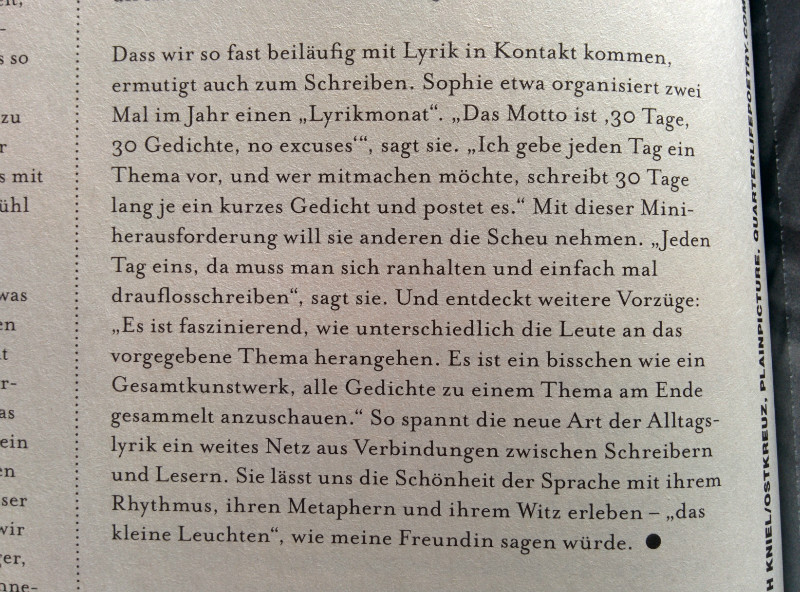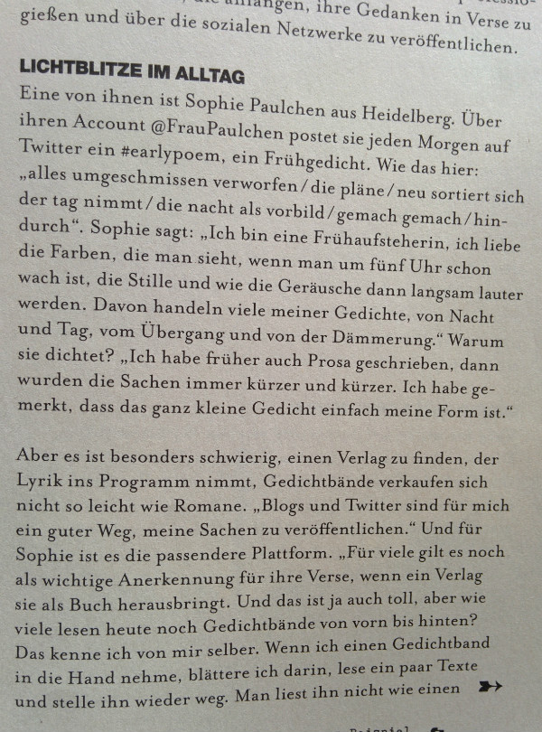 „die neue alltagslyrik“. so der titel. darin ist ein text von mir mit abgedruckt und steht auf einer seite zusammen mit einem text von judith holofernes. ein #earlypoem von mir ist abgedruckt. gesprächsstücke aus dem interview stehen da wie etwa „ich bin eine frühaufsteherin, ich liebe die farben, die man sieht, wenn man um fünf uhr schon wach ist, die stille und wie die geräusche dan langsam lauter werden.“ ein tweet von mir ist abgedruckt zu meinem lieblingsgeschichtenerzähler, dem regen.